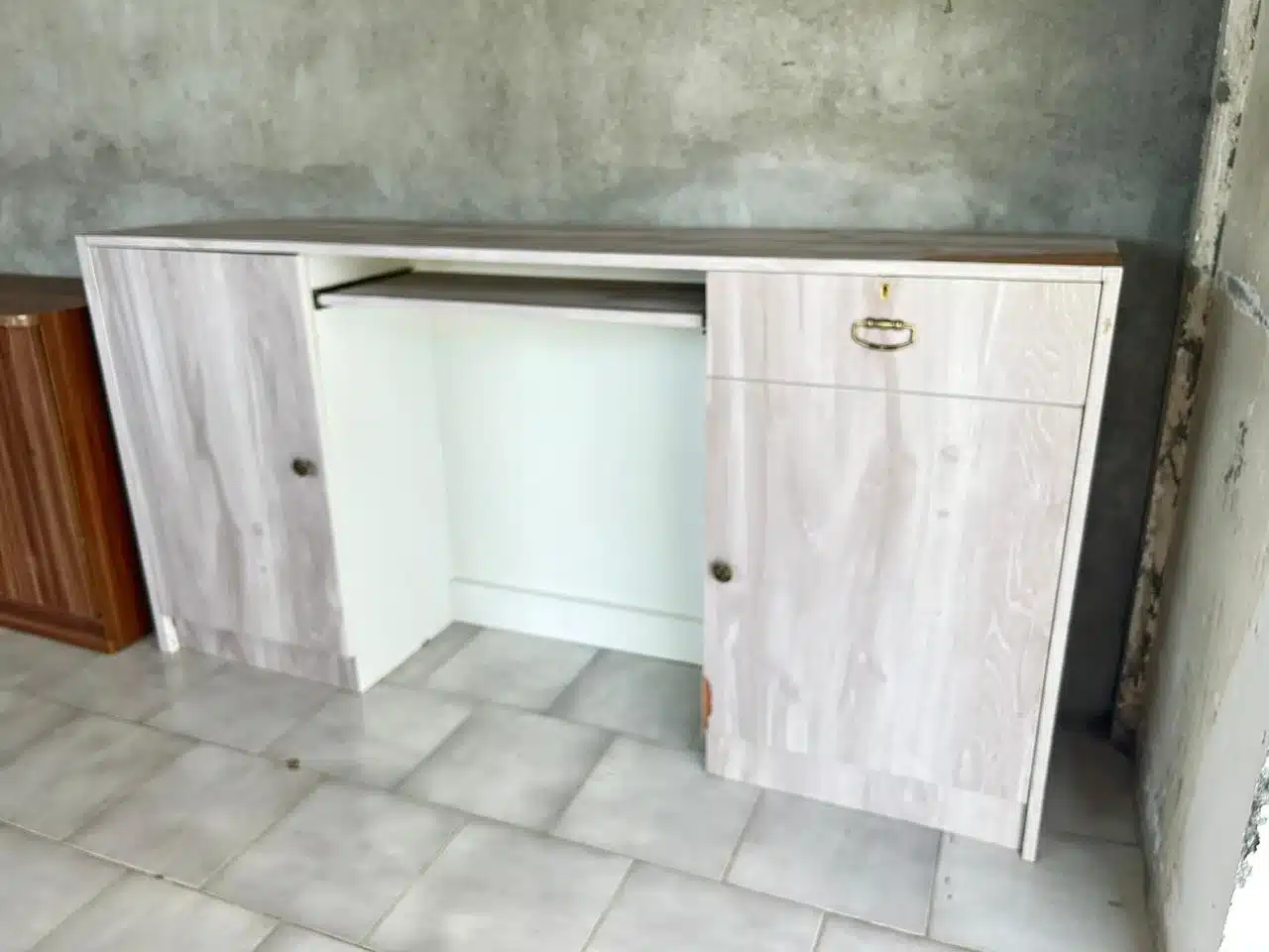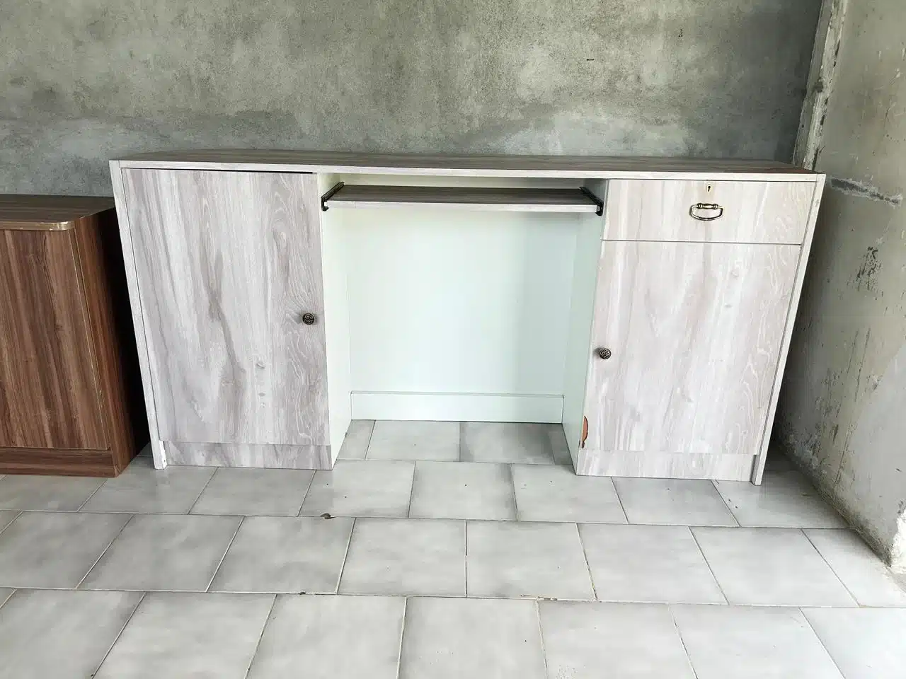 Multi Purpose Wooden Reception cum Cash counter ,front desk Table with storage draws and Racks. Product Details & Features: Size : Length-6 feet X Breadth-1.3 feet X Height-3 feet Damage: Slight Mica Peeling Pattern: Wooden Draws : Yes Storage : Yes